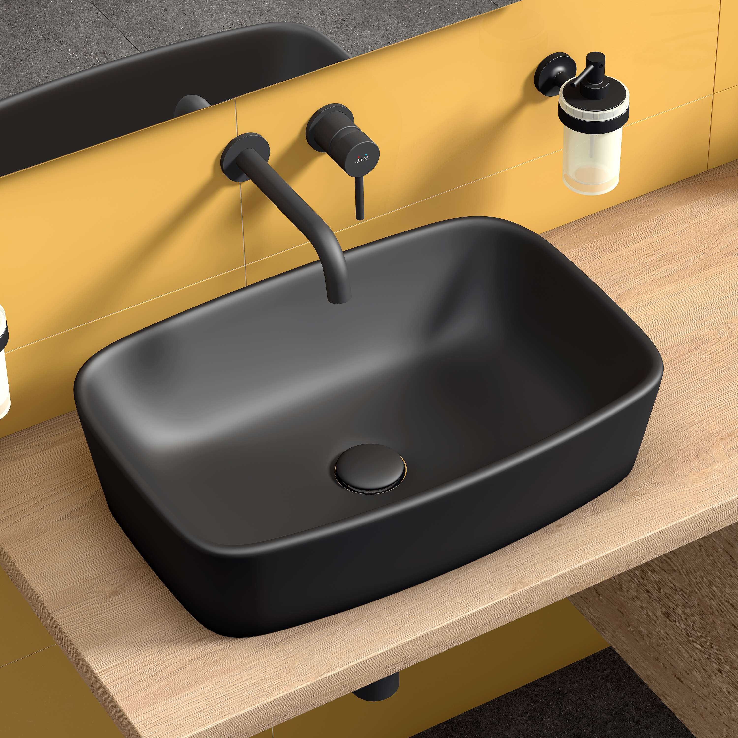 Série koupelnových baterií Mio Style patří mezi oblíbenou řadu díky elegantním tvarům a jednoduchým pákovým ovládáním. Novinkou je podmítková umyvadlová baterie v barevném provedení černý mat, jehož výhodou je sametově hebký zcela jednotný povrch, který je vysoce odolný proti poškrábání. Baterie obsahuje mosazné těleso a vrchní sadu a velmi kvalitní keramickou kartuš (Ø 35 mm) a úsporný perlátor Neoperl s průtokem 5l/min. Perlátor je vyrobený ze speciálního materiálu proti usazování vodního kamene. Další výhodou vodovodní baterie jsou přepínače tj. klapka proti zpětnému nasátí znečištěné vody. Doporučujeme objednat umyvadlovou výpusť Click-Clack 5/4“ (H3702F97161031) a umyvadlový sifon Mio Style G5/4“ × DN32, ABS, (H3742F07160001) v černé matné barvě. Koupelnové baterie a sprchové příslušenství Mio je kompletováno a 100% testováno v továrně JIKA ve Znojmě.